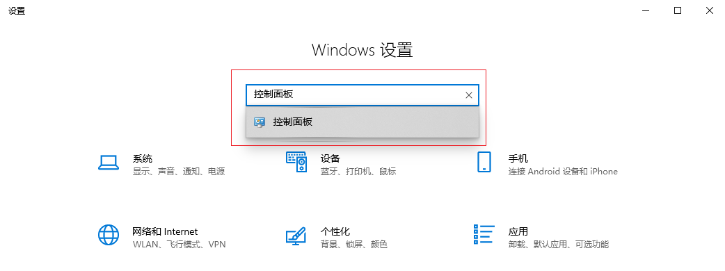 1.在鍵盤上按下【win+i】組合鍵,在調(diào)出的設(shè)置選項界面的搜索框輸入【控制面板】,然后點擊進入。