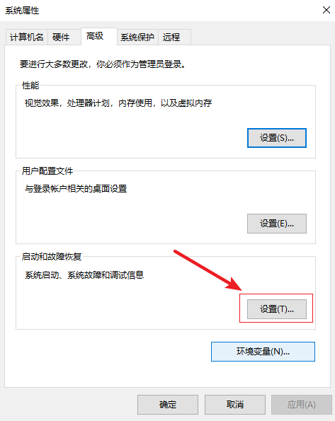 3.進入系統屬性界面,點擊【啟動和故障恢復】下的【設置】。