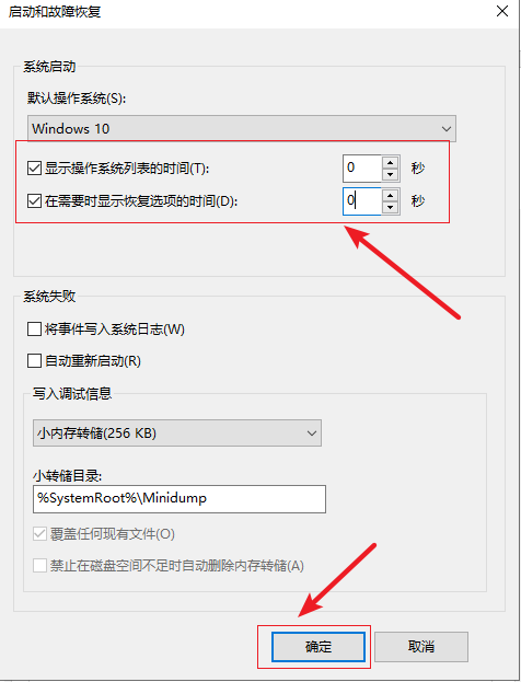 4.然后勾選【顯示操作系統列表的時間】和【在需要時顯示恢復選項的時間】兩個選項,并把這兩個選項的時間數值都修改為【0】秒,最后點擊【確定】即可。