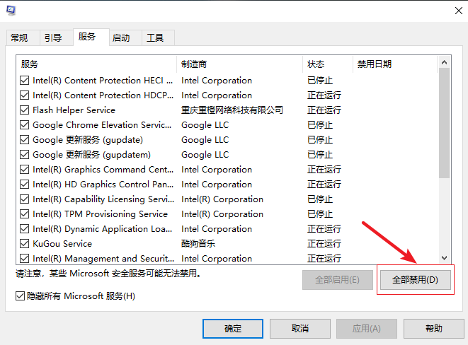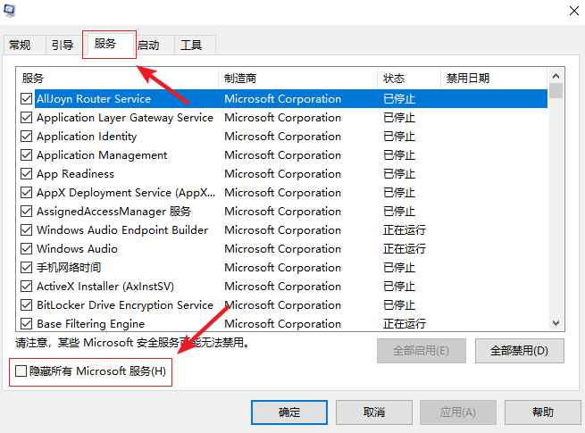 2.進入后,上方切換到【服務】選項卡,然后勾選【隱藏所有Microsoft】選項。