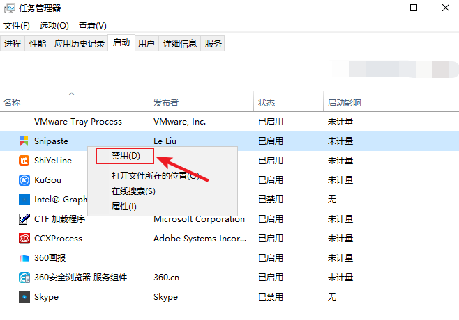 5.然后進入任務管理界面,在這里可以看到所有的啟動項,然后右鍵逐個選擇【禁用】,禁用完了之后重啟電腦即可。
