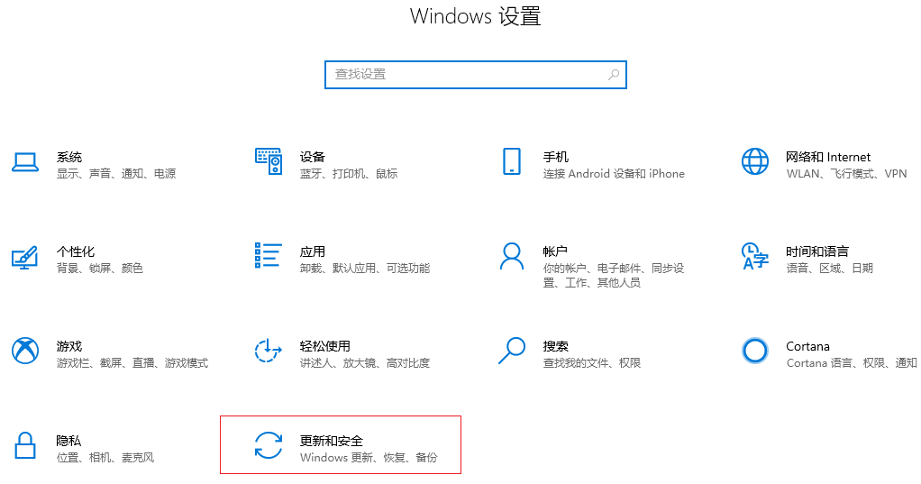 1.在鍵盤上按下【win+i】組合鍵,調出設置選項界面,選擇【更新和安全】進入。