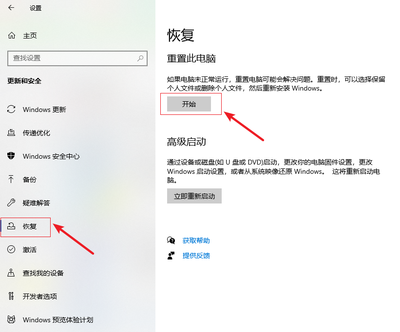 2.進入后,在左側選擇【恢復】,然后點擊右側重置電腦下的【開始】。