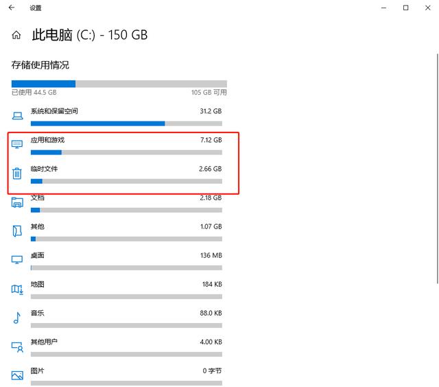 2.此時(shí)電腦會(huì)跟手機(jī)一樣顯示出電腦的存儲(chǔ)空間信息,我們可以在“臨時(shí)文件”和“應(yīng)用和游戲”中刪除無用文件,釋放存儲(chǔ)空間。