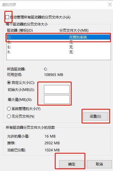 2.在以下窗口中取消勾選“自動(dòng)管理分頁文件大小”復(fù)選框,如下圖所示。將空間設(shè)置好大小后點(diǎn)擊“設(shè)置”并“確定”,最后重啟電腦就可以完成虛擬內(nèi)存的轉(zhuǎn)移了。