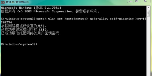 netsh wlan set hostednetwork mode=allow ssid=xiaoming key=18901234