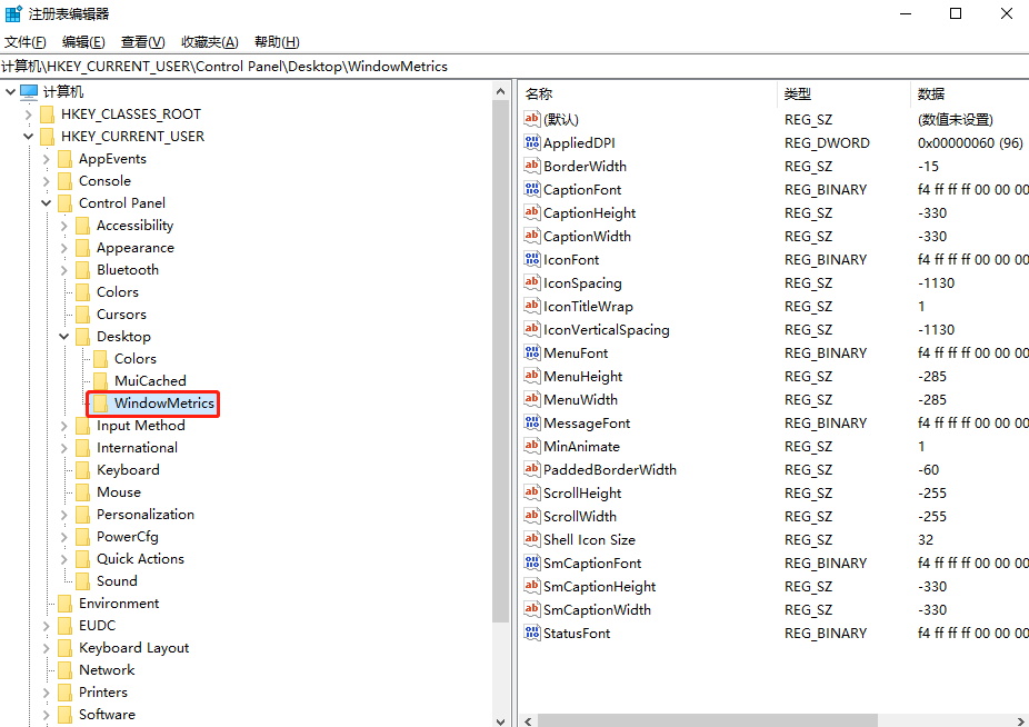 2.在打開的Windows注冊表界面中依次展開以下選項(xiàng):HKEY_CURRENT_USER\Control Panel\Desktop\WindowMetrics,如圖所示: