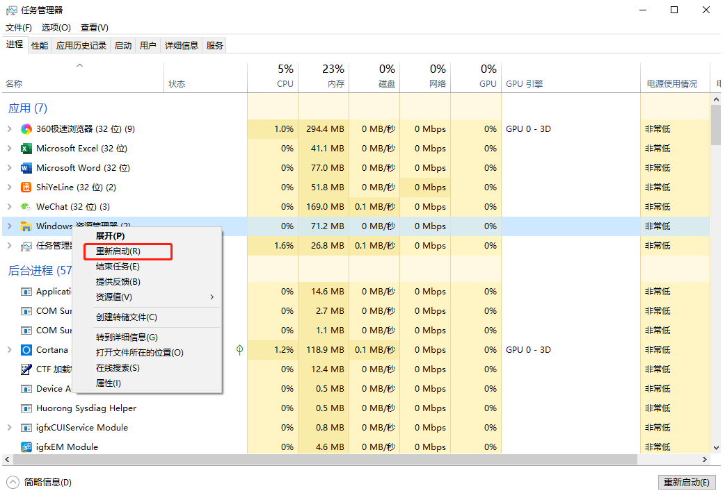 4.設(shè)定好了之后大家打開任務(wù)管理器,隨后右鍵選中“windows資源管理器”進(jìn)行“重新啟動”。