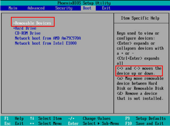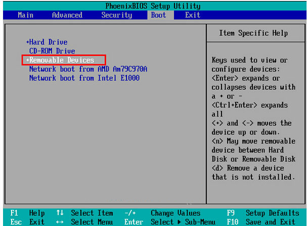 2.此時在bios界面中使用方向鍵將鼠標移動至“boot”選項并找到U盤設備。(不同電腦的U盤設備顯示不同,一般為U盤名稱或usb開頭的選項),小編這里顯示“removeble device”,即“可移動設備”。