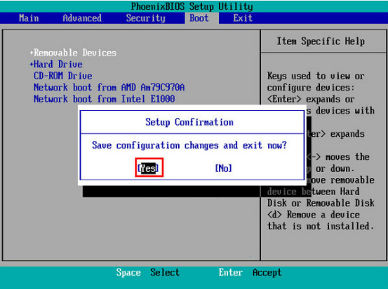 4.隨后按下“F10”按鍵保存設置,在窗口中選擇“yes”回車即可。