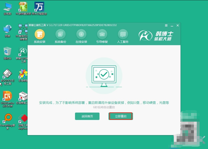7.進入PE界面后,系統會自動開始win10的安裝流程,這個過程無需你操心,安裝結束后,點擊“立即重啟”就可以了。