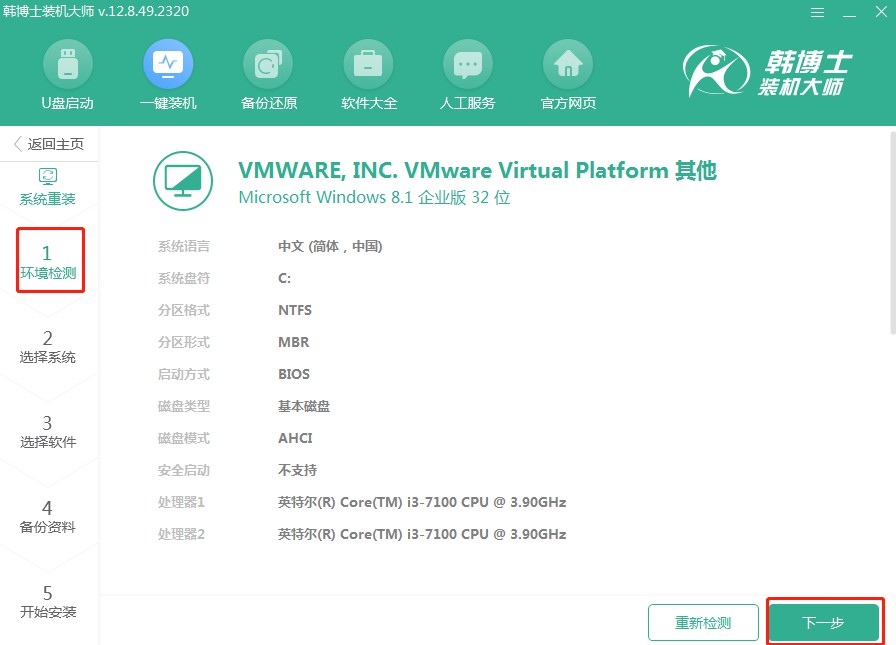 2.現在系統正在執行“系統檢測”,請您耐心等待,無需做其他任何事情。檢測結束后,再點擊“下一步”。