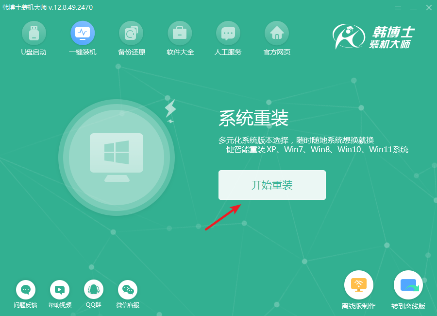 1.先訪問官網,下載“韓博士裝機大師”,并將其放置在桌面上。完成下載后,雙擊桌面上的圖標來啟動程序。在主界面中,點擊“開始重裝”。
