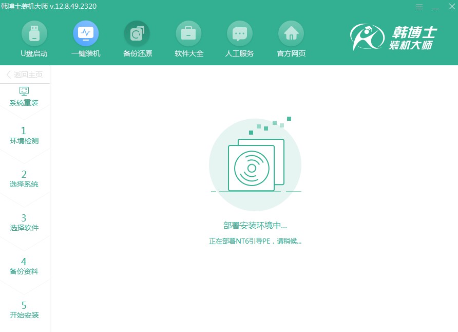 1.請先下載“韓博士裝機大師”,并將其保存至桌面。下載完成后,雙擊圖標打開程序,在主界面上點擊“開始重裝”。
