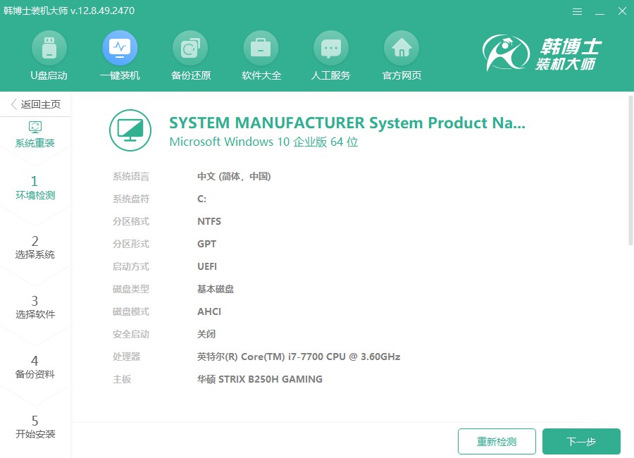第二步,韓博士會自動進行系統(tǒng)環(huán)境檢測,等到檢測結(jié)束后,點擊屏幕上的“下一步”按鈕。