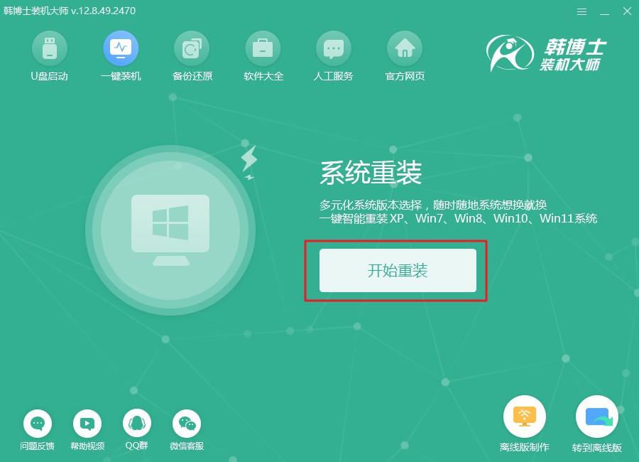 1.去韓博士官網下載最新版本的裝機大師,安裝到電腦后打開軟件,找到“開始重裝”選項并點擊,按步驟完成接下來的操作流程。