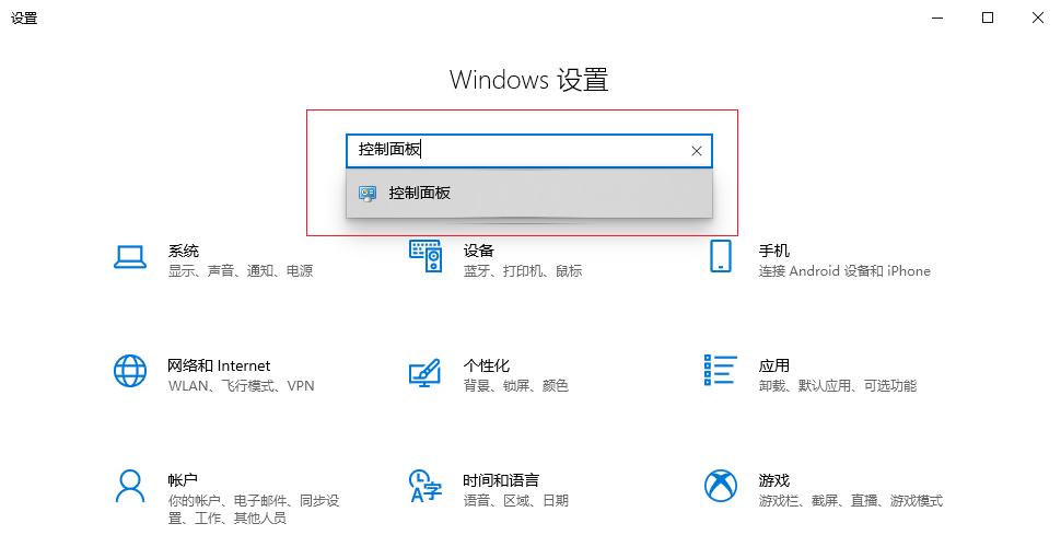 1.在鍵盤上按下【win+i】組合鍵,調出設置選項界面,然后在上方搜索欄輸入【控制面板】,點擊進入。