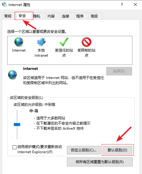 3.進入Internet屬性界面,在上方切換到【安全】選項,然后點擊【默認級別】。