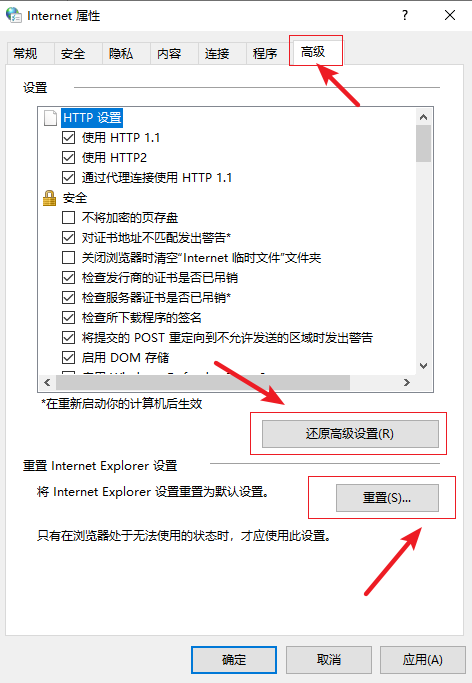 4.接著切換到【高級】選項卡,點擊【還原高級設置】-【重置】。