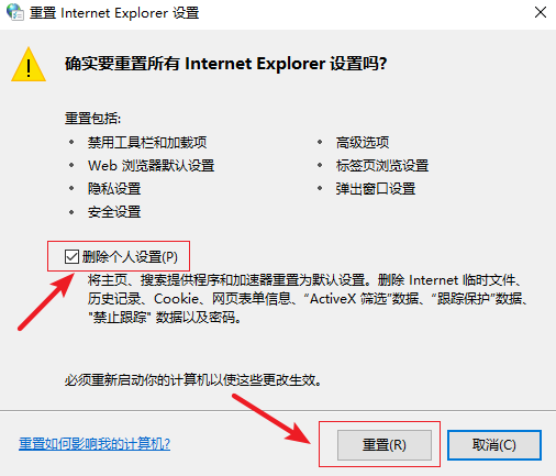 5.進入以下界面,勾選【刪除個性化設置】,最后點擊【重置】按鈕即可。