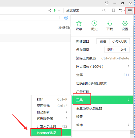 1.打開瀏覽器(以360瀏覽器為例),選擇瀏覽器右上角“設置”的符號,接著點擊【工具】,選擇【Internet選項】。
