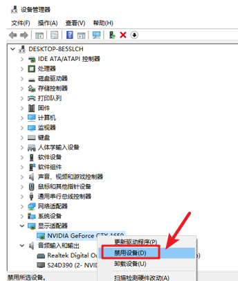 6.進入設備管理器后,找到并點開“顯示適配器”,右擊獨立顯卡后再選擇“禁用設備”,最后重啟電腦。