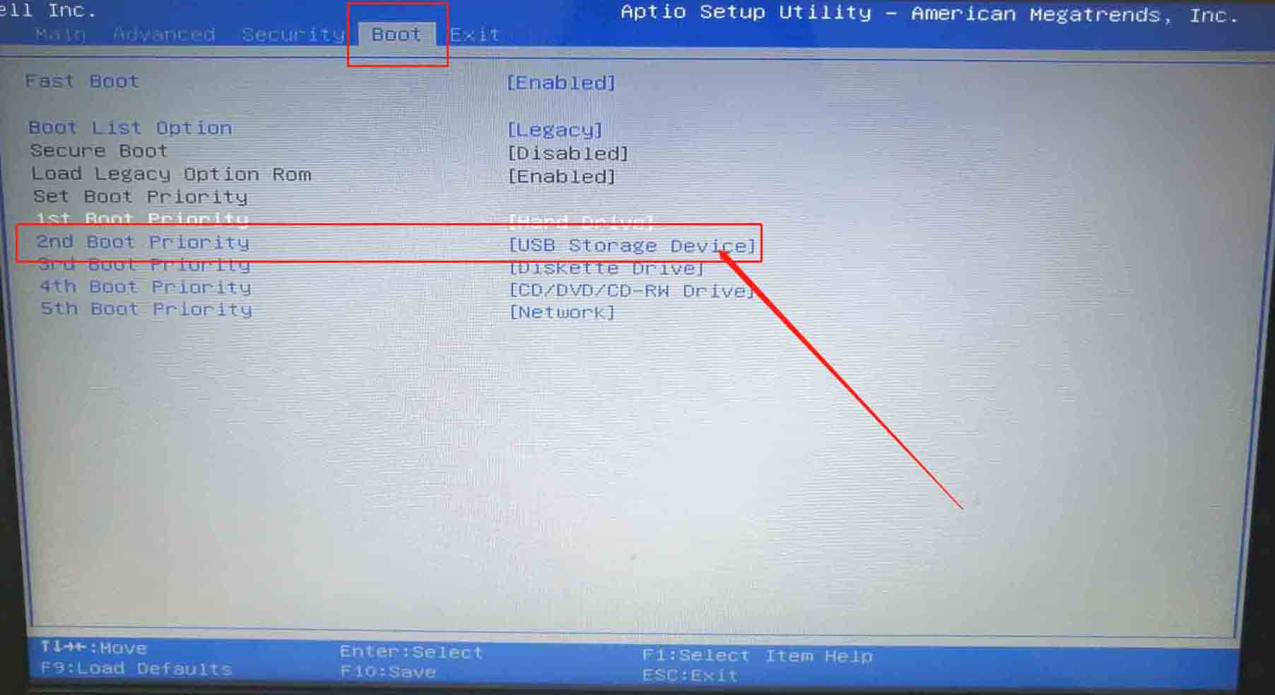 3.使用方向鍵選擇U盤設(shè)備后,使用“+”將usb選項移動至第一項,隨后按下“F10”保存設(shè)置。