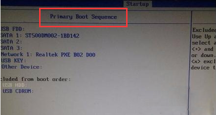 2.成功進入BIOS設置界面后使用方向鍵將箭頭切換至“Startup”選項,進入“Primary Boot Sequence”主要啟動項設置界面。