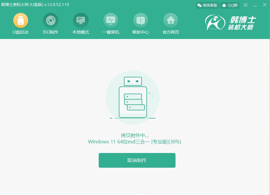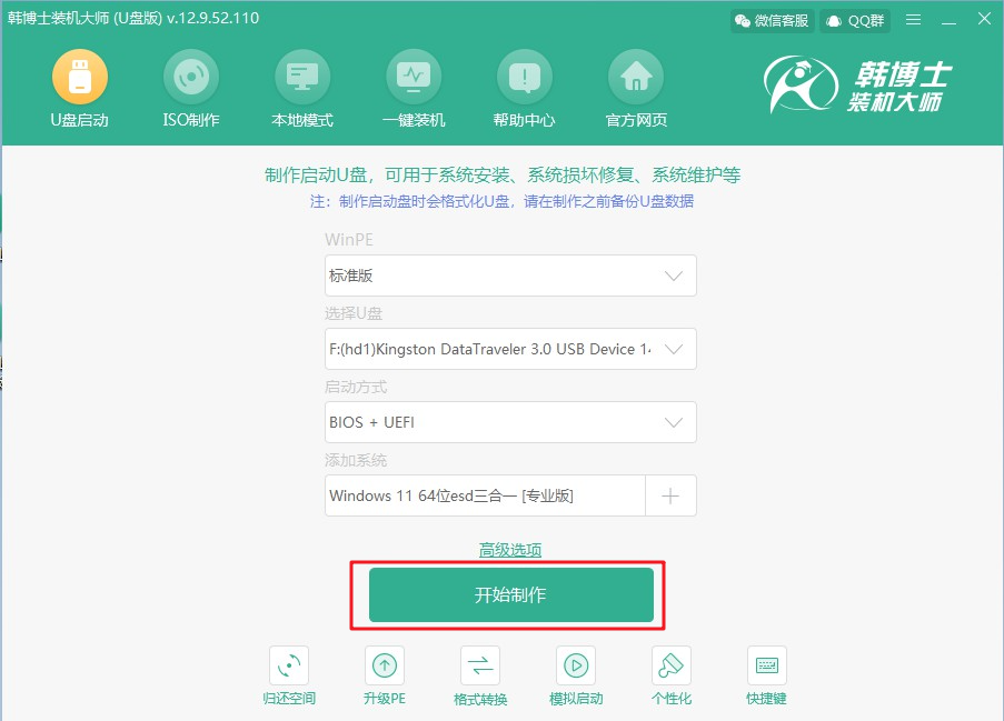 以上就是具體的win11閃屏怎么重裝系統的詳細方法和步驟了,如果你也遇到了win11開機閃屏的問題,可以參考上面的教程給電腦重裝win11系統。如果在重裝的過程遇到問題的話,可以咨詢官網的技術客服,會耐心為你解答!韓博士支持一鍵云U盤啟動制作,安全好用!