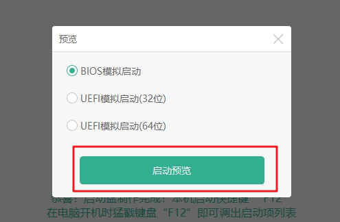5.韓博士U盤啟動(dòng)盤制作完成后,會(huì)進(jìn)行U盤啟動(dòng)模擬預(yù)覽窗口,可勾選“BIOS模擬啟動(dòng)”選項(xiàng),點(diǎn)擊“啟動(dòng)預(yù)覽”進(jìn)行測(cè)試。